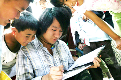 学生会主席,奥运涂鸦《胜利.中国红》作者徐开林现场教孩子们画画