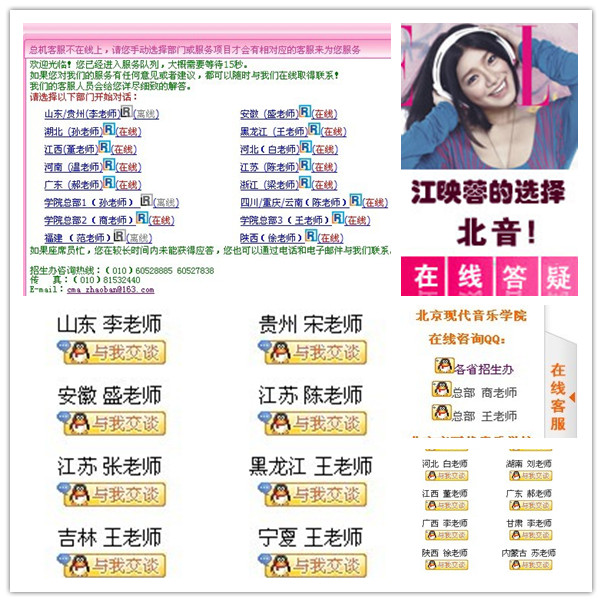 学院在以电话、QQ、商务通等咨询方式为主的同时,辅以北京现代音乐学院新浪微博(http://weibo.com/u/1277354067)北京现代音乐学院腾讯微博(http://t.qq.com/bjcma0)及北音招生办新浪微博(http://weibo.com/u/2120816233)为考生及家长解答各类招生问题。目前,学院多种咨询方式运转有序,并且不断完善和优化,为广大考生及家长提供优质高效服务,效果显著,大受好评。