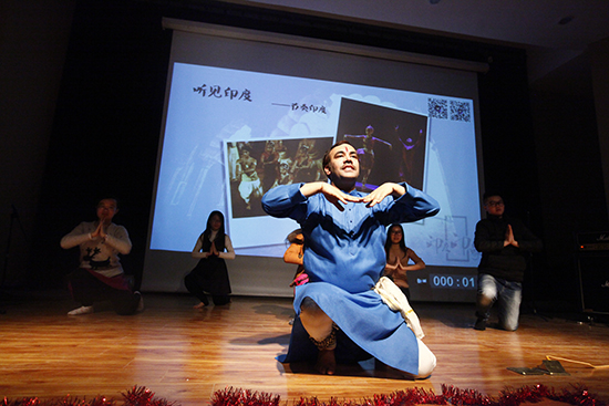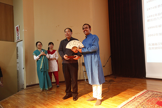 现场,两位嘉宾首先与同学们分享了他们各自的印度印象,出生在德里的纳文老师为同学们介绍了自己学习印度传统舞蹈卡塔克的经历及关于印度艺术的传承、宗教等文化,并现场解答了同学们诸多关于印度的疑问;身为民乐演奏家的姚策先生则与同学们分享了他一生求学艺术的经历及情结西塔琴的诸多乐闻趣事。随后,二位艺术家一起合作,用Tabla鼓和西塔琴为同学们演奏了多首印度音乐作品,姚策老师还意犹未尽地献上了他多年来一直钟爱的一首印度电影主题曲,纳文老师为了满足同学们对印度舞蹈的好奇心,现场教授了卡塔克舞蹈。讲座在寓教于乐的氛围中圆满结束。