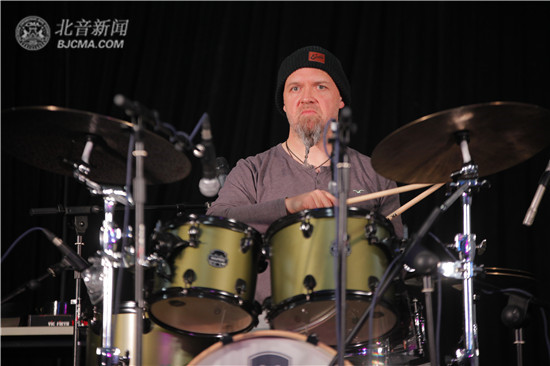 紧接着,Claus Hessle与大家分享了自己对鼓、句子、指法、技巧以及基本功练习方面的理解和心得,并进行了示范演奏。“在同样的握棒方式下,可以利用控制鼓棒与打击面产生的物理回力来实现不同的演奏效果;手上的变奏同样可以应用在脚上;如何进行不断重复的五连音演奏和16分音符五连音演奏;压缩音符和扩展音符的演奏充满了无限潜能,单击、双跳、复合跳、单叠 、双叠 、paradiddlle、paraparadiddle等,演奏者可以将自己天马行空的想像都付诸进来……”