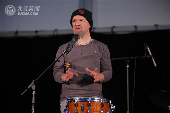 现场,Claus Hessle以一段精彩的即兴Solo拉开讲座序幕。随后,Claus Hessle以与观众问答互动、演奏示范的形式对爵士鼓学习、练习中常见的问题进行了讲解。针对,观众提出的“什么是律动”这一问题,Claus Hessle告诉大家,律动是鼓手最基本的功能,不同的乐风对律动的定义也不尽相同。