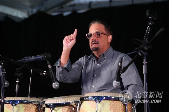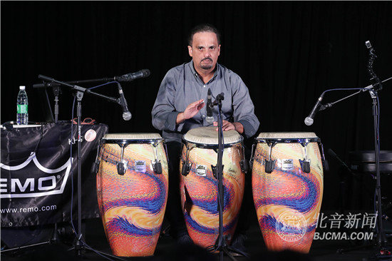 Jimmie Morales还进行了邦戈鼓的salsa演奏,邦戈鼓可以用来添加其他的元素,是节奏鼓中用来添彩的重要乐器。随后,Jimmie Morales做了一系列不同风格的精彩即兴演奏,他认为即兴演奏就如同是与人说话,会有不同的语速和节奏,有急有缓,有轻有重。“每一个康佳鼓演奏者的风格都是不一样的,同一套鼓不同的人演奏效果不一样,因为每个人的力度和手型都不一样,练习者在练习slap时,要寻找自己最好听声音,当找到时要在鼓皮上做记号,每次都击打在这个位置进行反复练习。”