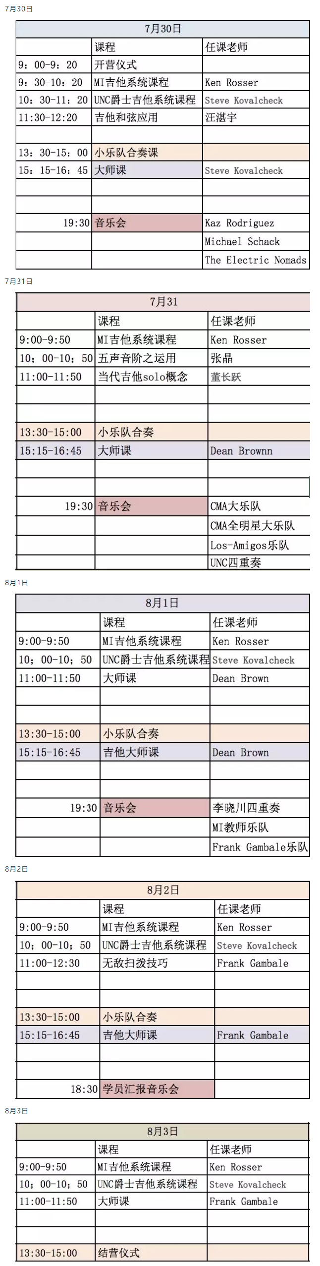 7月30日,北京现代音乐研修学院首届“CMA国际音乐训练营”暨北京爵士音乐节正式开营。本次CMA国际音乐训练营吉他专业师资力量超前强大,既有Frank Gambale、Dean Brown这样的世界顶级吉他大师,也有来自美国MI音乐学院的吉他教授Ken Rosser、以及美国UNC爵士系的Steve Kovalcheck教授专家,还有来自北音爵士乐学院的优秀师资!众多国内外电吉他领域内的权威汇聚北音,共同开启吉他专业课程集训。