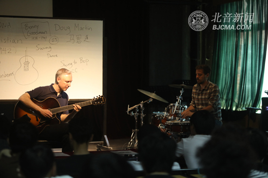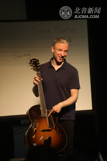 5月28日,美国著名爵士吉他演奏家Doug Martin做客北京现代音乐研修学院大师讲堂,在J501教室为爵士乐学院的同学们带来一场精彩的大师课。