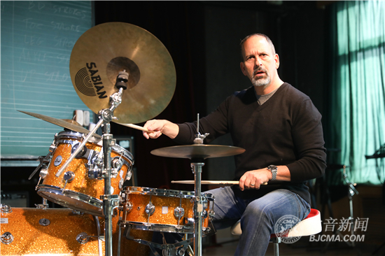 Mike Packer以演示且问答的互动形式进行课程分享,针对音乐创作、乐器练习及舞台演奏等方面的经历及心得为同学们进行了详细讲解,并表示“你可以在演奏过的节奏中,随时加入兴演奏,尝试观察节奏的变化。也可以在这个节奏型里,四肢都加入即兴演奏,让你在鼓上演奏的更自由。”