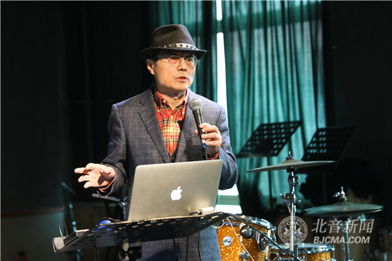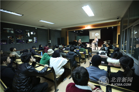 近日,好莱坞影视配乐大师汪洪携世界著名八弦贝斯演奏家Hova Burian做客北京现代音乐研修学院大师讲堂,在J501教室为爵士乐学院的同学们带来一场精彩的大师课。