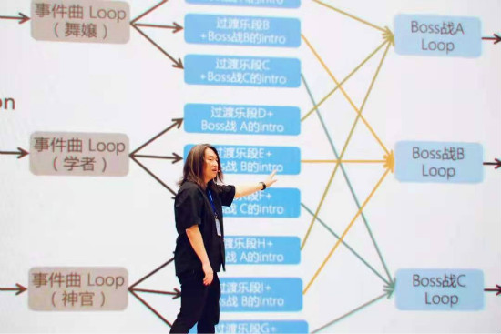 张志伟先生用“变脸”和“下一个路口”来对主流互动音乐的两种方式作出形象的比喻。随着游戏角色进入的空间、环境、维度等发生变化,音乐也要实时不间断的“变脸”来配合空间环境切换和维度的转变。张志伟先生分享了自己的制作技巧——在音乐旋律不变的基础上,以小节、节拍为基准,进行纵向配器的变化,切换各种曲风,就可以巧妙的实现音乐的互动。“下一个路口”的互动音乐方式则是音乐进行横向的变化。音乐设计师要保持远瞻性,永远要考虑后续途径,即“下一个路口”,例如随着战斗的进展和游戏角色血量的减少,曲风也会随之发生变化。目前,人工作曲还是互动音乐重要的创作方式。因此作为音乐设计者,在尊重音乐本身力量的基础上,也要尽可能地拓宽作曲风格,并多多学习录音、混音等技能。互动音乐对艺术家提出了更新更高的要求。