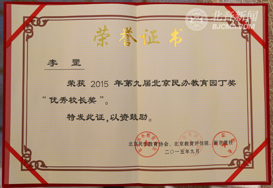 2015年第九届北京民办教育园丁奖“优秀校长奖”荣誉证书
