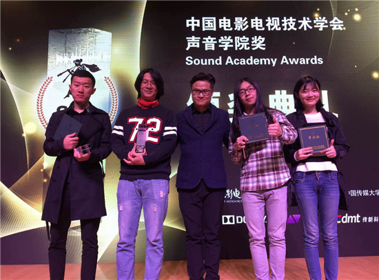 音乐科技学院常务副院长王磊与录音艺术系张锦亮、李漠然、谭聪、姜龙四名获奖同学合影