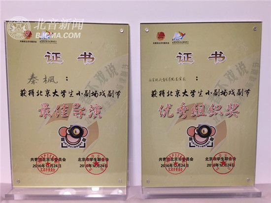 第三届北京大学生小剧场戏剧节“最佳导演奖”和“优秀组织奖”获奖证书