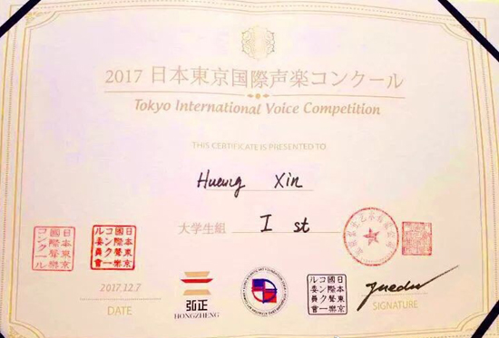 近日,“2017年东京国际声乐”比赛在日本东京落下帷幕。北京现代音乐研修学院音乐教育学院声乐系2017级学生黄鑫荣获本次大赛一等奖。