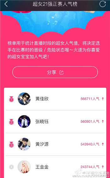 “超女21强晋级19强”直播时段黄佳欣人气值排名第一