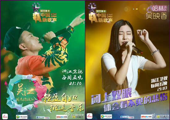 《中国新歌声》是由浙江卫视联合星空传媒旗下灿星制作打造的大型原创专业音乐节目。自2016年起,系列节目不再引进国外版权,而是采用中国全新原创音乐模式。在《中国新歌声第一季》中,北音学子吴江、吴映香分别成功加入了周杰伦和哈林战队。