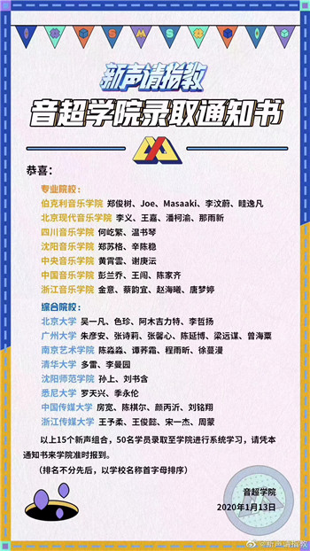 伯克利音乐学院、中央音乐学院、中国音乐学院、北京现代音乐研修学院等15所顶尖高校,15种不同声音,将打造校园专属的狂欢派对,迎接新年的第一份礼物!2020年国内首档校园音乐综艺节目《新声请指教》将于1月19日起每周日22:00在浙江卫视和爱奇艺播出。北京现代音乐研修学院学子李义、王嘉、潘柯渝、那雨新组成新声4G组合,被节目组音超学院录取。期待他们的精彩表现!
