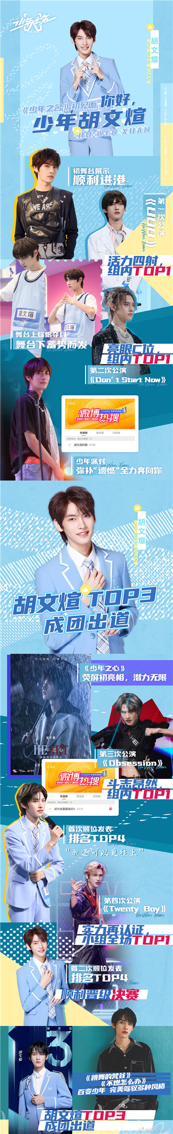 8月29日,优酷自制综艺《少年之名》成团夜总决赛落下帷幕,北京现代音乐研修学院毕业生胡文煊以第三名的好成绩与其他六位少年组成“S.K.Y天空少年”顺利出道!在“少年之名舞台”的这片天空,他一直勇于追求自己的梦想!相信未来,胡文煊能为大家带来更多惊喜!