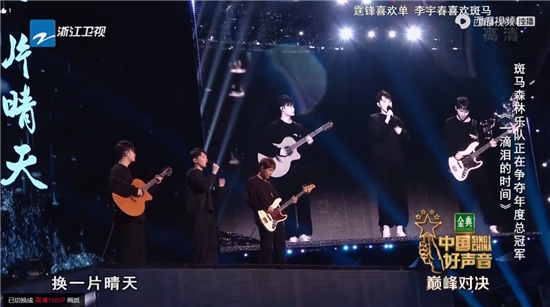 现场,李荣浩导师带领五强学员斑马森林乐队演唱《倒带》,随后斑马森林乐队在比拼中演唱《一滴泪的时间》,不同于原唱师兄赵紫骅的深情和低沉的声线,斑马森林版本融合了乐队元素,bass和吉他的完美配合为这首歌增添了额外的俏皮感,依旧美好动人!