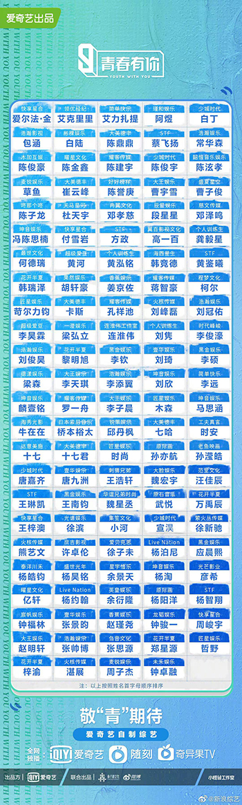 近日,《青春有你3》官宣了119名训练生名单,北京现代音乐研修学院表演系学子梓渝、黎明旭、流行舞系学子韩竞德、流行演唱学院学子时尚、爱尔法·金、周峻宇、应晨熙加盟节目。