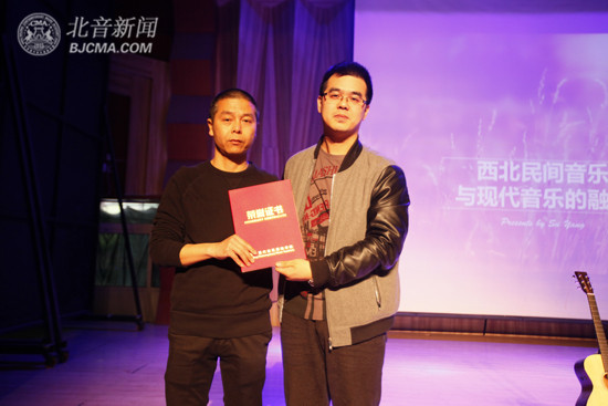 现场,苏阳播放了一段朱仲禄的“河州大令”曲目开始了本次讲座。他首先与大家分享了自己的个人音乐历程,并由深入浅出地向大家介绍了布鲁斯和西北民乐在语言和旋律之间的共同之处,同时现场用吉他亲身示范讲解了作为音乐人的个人感悟。苏阳说,“我个人也认为音乐的精神不仅仅是这些思考,因为真正好的音乐最终是精神和心灵。”随后,在互动环节,苏阳回答了同学们提出的各种问题,欢愉的讲解使同学们茅塞顿开。苏阳还邀请同学一起上台唱响了其经典曲目《贤良》,讲座在一片欢声笑语中落下帷幕。我院流行演唱学院教学院长尤静波代表北音颁发了“北京现代音乐研修学院客座教授”聘书。