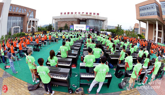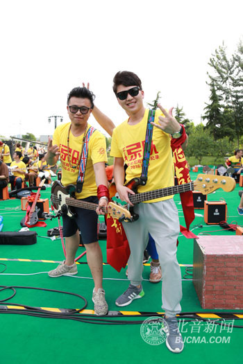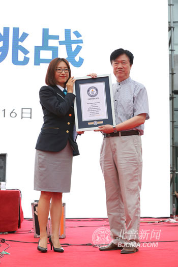 6月16日下午,北京现代音乐学院1050名摇滚音乐人齐聚北音姊妹院校——天津体育学院运动与文化艺术学院,与摇滚教父崔健激情唱响,成功刷新“世界最大规模摇滚乐队”吉尼斯世界纪录。吉尼斯官方认证官现场见证了这项史无前例的壮举,并向全体参与者代表——北音常务副院长李平颁发认证证书。此前,该项吉尼斯世界纪录是2006年由520名法国摇滚音乐人共同创造的。