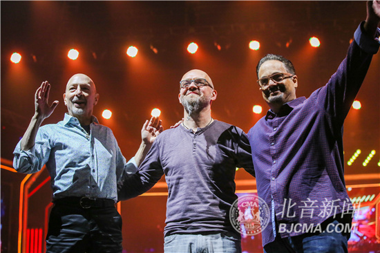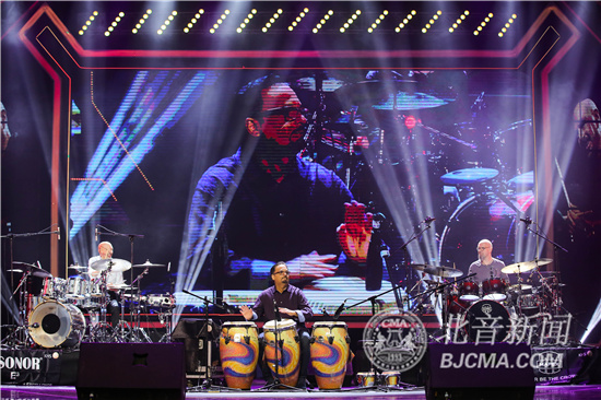 最后,三位国际顶尖鼓手的联袂献艺,更将本次音乐会推向最高潮。他们合奏的曲目既充满了美妙的爵士味道,又不失热烈的摇滚氛围,在演出中展示出的四肢协调性及即兴技巧更令人惊讶,前所未有的同台献艺让人酣畅淋漓。乐曲终了,现场观众起立鼓掌欢呼,向大师致敬。至此,第四届北京现代国际鼓手节首场音乐会圆满落幕。