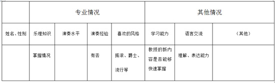 了解学情需要进行摸底调查,对学生进行乐理基础知识和演奏水平进行了解。通过入学考试了解以及首节课上的当面谈话这两种形式能够比较全面了解学生,从而得知学生对乐理基础知识的掌握程度,是否有演奏经验,演奏水平达到何种程度,喜欢的音乐风格,着重了解学生的律动感;同时需要了解学生其他一些相关信息,得到的信息越多,越有利于后续对学生的针对性辅导,不单单是专业知识上的传授,而应该是需要全方位关心关注学生。