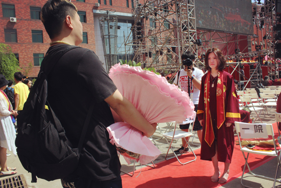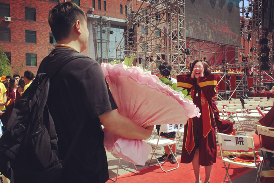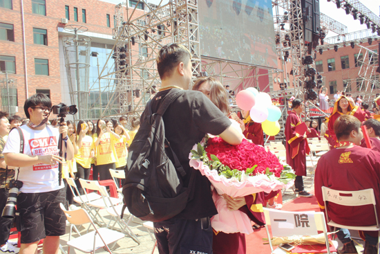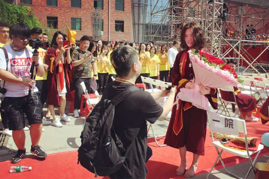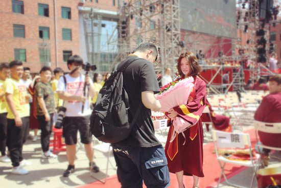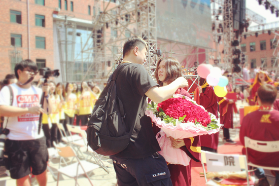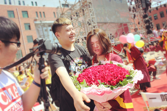 5月16日上午,在北京现代音乐学院“那年,我们在北音相遇……”为主题的毕业典礼上,帅气的前毕业生杨红旭手捧玫瑰,单膝跪地,向娇羞的本届毕业生邓梦丽求婚,在祝福的掌声中为她戴上了戒指,上演浪漫一幕。