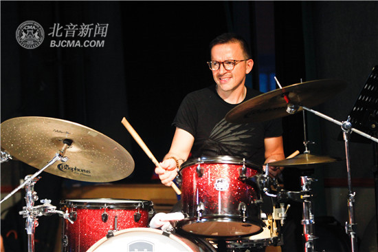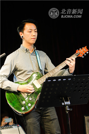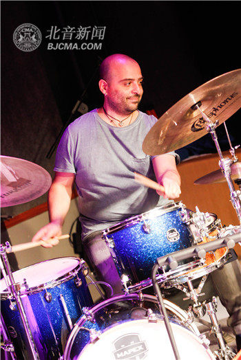 此次晚会由爵士乐学院本学期新入职的教师们带来。来自五个国家的六位老师,齐聚J501,共同奏响爵士之魂,他们是:当今欧洲爵士音乐圈最知名的原创鼓手之一,CANOPUS爵士鼓代言人Antonio Fusco;爵士钢琴家,作曲家以及编曲家裴世珍;爱尔兰爵士贝斯演奏家Daniel Callaghan;京城最受欢迎的爵士吉他演奏家之一秦健楠;曾在与Reggie Thomas的学习过程中,编写了自己的爵士教育教学大纲和爵士吉他教学大纲的张晶;以及哥伦比亚著名爵士鼓手,作曲家Victor Bastidas Rodriguez。演出现场,学生们忘我地跟着节拍打节奏,用他们的欢呼和掌声,表达对新教师的敬意,场面十分火热。