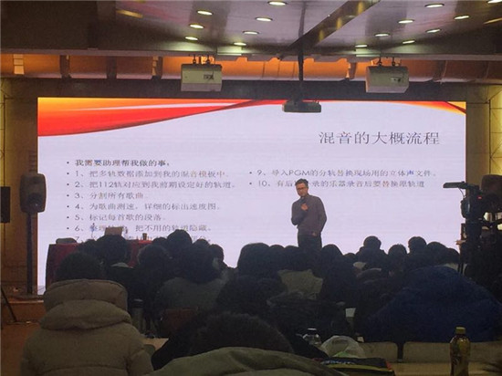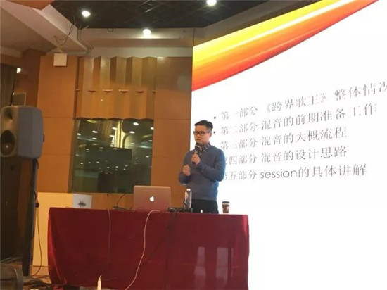近日, 2017江苏数字音乐与声音设计大赛在南京艺术学院成功举行。赛程第二日,北京现代音乐研修学院音乐科技学院王磊院长作为特邀嘉宾,在现场做了一场关于“跨界歌王”节目混音的讲座,深受现场学生喜欢。