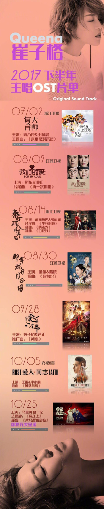 江映蓉携手韩磊唱响《人民的名义》主题曲《以人民的名义》,毛泽少献唱《思美人》片尾曲,崔子格为超级IP《将军在上》、爱情喜剧《复合大师》、古装偶像剧《秦时丽人明月心》、年度话题热剧《那年花开月正圆》、网剧《大话西游之爱你一万年》等剧献声,王也演唱热播剧《我的体育老师》插曲……