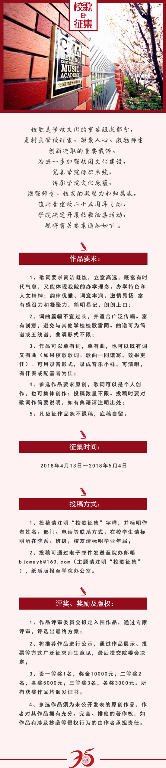 校歌是学校文化的重要组成部分,是树立学校形象、凝聚人心、激励师生创新进取的重要载体。为进一步加强校园文化建设,传承北音文化底蕴,增强师生、校友凝聚力和归属感,值北京现代音乐研修学院建校25周年之际,学院启动“北音校歌”征集,征集时间为2018年4月13日—2018年5月4日,投稿可通过电子邮件发送至邮箱bjcmayb@163.com(主题请注明“校歌征集”),纸质版报至北音学院办公室。此次征集活动设一等奖1名,奖金10000元;二等奖2名,每名奖金5000元;三等奖3名,每名奖金3000元;所有获奖作品均由学院颁发荣誉证书。