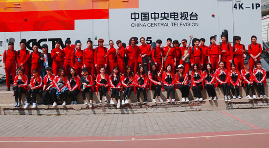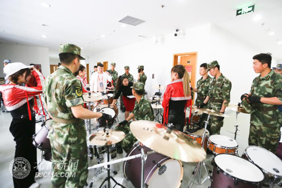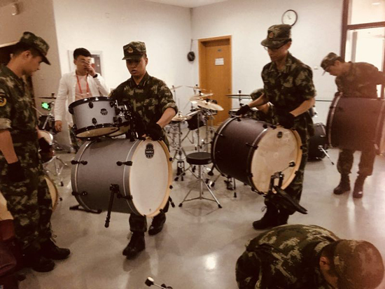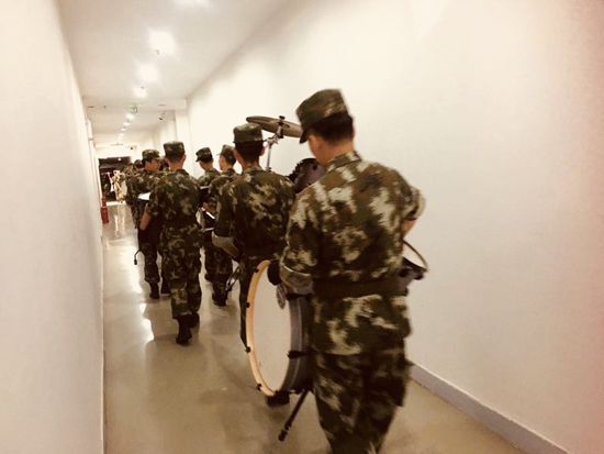 “我们的设备较多,光二十套鼓就有数百件镲架、镲片、踩锤等部件,搬运很困难,道具组人手不够,除了央视的工作人员,在场的学子们也都全部亲自上阵,导演组还帮我们联系了60余名陆军和空军的国防生,帮着我们一起搬运设备。”负责带队的爵士乐学院副院长王讴凯老师说道,“我们的设备对储放空间要求较大,央视导演组更是倍加关照,帮助协调搬运”。存放区域距演出场地还有很大一段距离,大家搬运完设备,都已经汗流浃背。