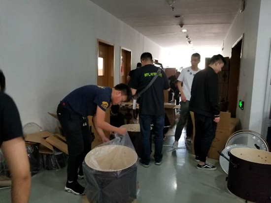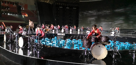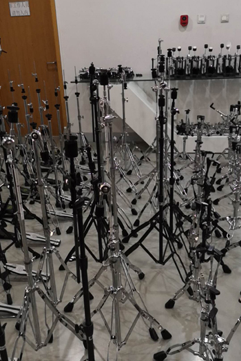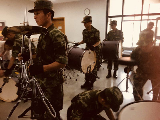 上午10时,高德鑫、柳欣然、李东东、孙成益、李彤彤、金松豪、王曦缘、韩佳雨等10余位经由专业老师推荐的既会打鼓又懂安装的学生组成的设备保障组,从学校出发,与送货的工作人员同时到达排练现场,开始一起组装、调试乐器,一刻不停地连续5个小时辛苦劳作,完成了全部乐器的安装工作。