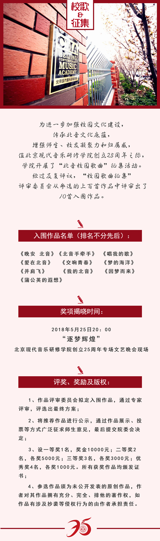 为进一步加强校园文化建设,传承校园文化底蕴,增强师生、校友凝聚力和归属感,值北京现代音乐研修学院创立25周年之际,学院开展了“北音校园歌曲”征集活动。经过反复评议,“校园歌曲征集”评审委员会从参选的上百首作品中评审出了10首入围作品,最终获奖名单将于5月25日晚8点《逐梦辉煌》北音创立25周年专场文艺晚会现场揭晓。