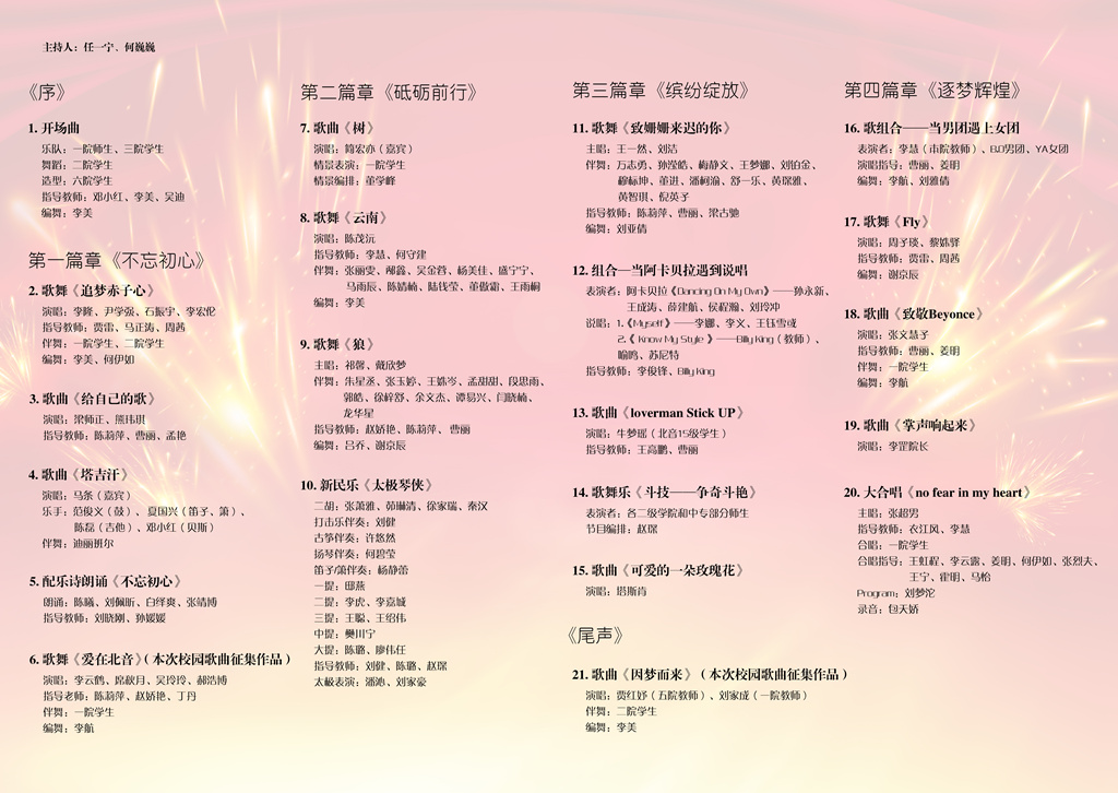 5月25日晚8点,“逐梦辉煌”北京现代音乐研修学院创立25周年专场文艺晚会即将隆重登场,晚会节目单火热出炉。晚会以北音这25年的发展历程为主线,分为《不忘初心》、《砥砺前行》、《缤纷绽放》、《逐梦辉煌》四个篇章,共21个节目,涵盖流行演唱、现场乐队、男团女团、阿卡贝拉、说唱、舞蹈、新民乐、诗朗诵等多种表演形式,看点十足。