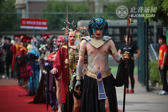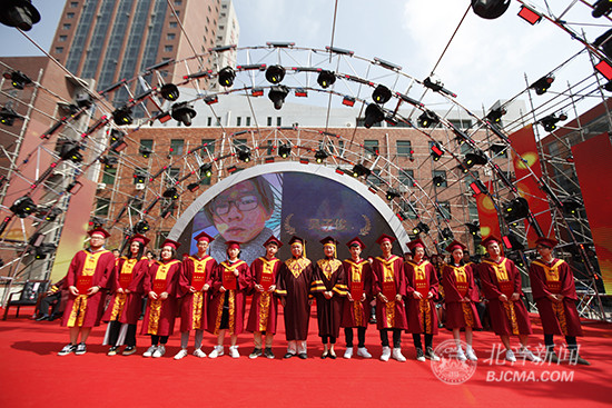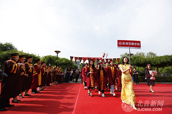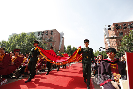 上午9时,踏着红毯,伴着潮音,领导嘉宾、各院师生先后入场,各个学院分别的舞蹈、乐队、DJ等方队表演,展现了各专业的特色和风采,其中最受瞩目的是影视特效化妆学院的Fashion小方队,每一位毕业生都陪着自己的作品一同前行,作品中有祭司、地狱使者、龙、怪杰、麒麟等,带着傲娇的表情,比划着夸张的动作,引起了现场师生的惊呼。随后,伴随着庄严的国歌,护旗手们身着统一服装,意气风发地拥护国旗、院旗、校旗出场,毕业典礼正式开始。