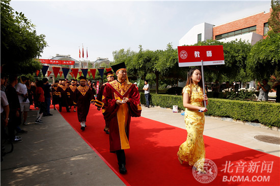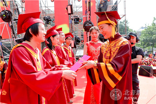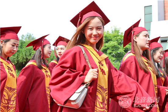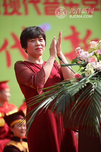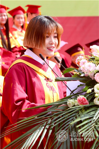 毕业生代表王玥首先代表2018届全体毕业生表达了对学校、对老师的感谢之情:“我深爱的北音,今天,女儿就要出嫁了。您送的嫁妆:“立德、求真、敬艺、善行”,我会一直装在行囊里,不负期望!我们将承载着这四年在学校滋养下潜移化于心中的北音精神,在未来的道路上走得更加坚定,更加宽广明朗。感恩母校、祝福母校!祝所有的老师们幸福健康,桃李芬芳!”