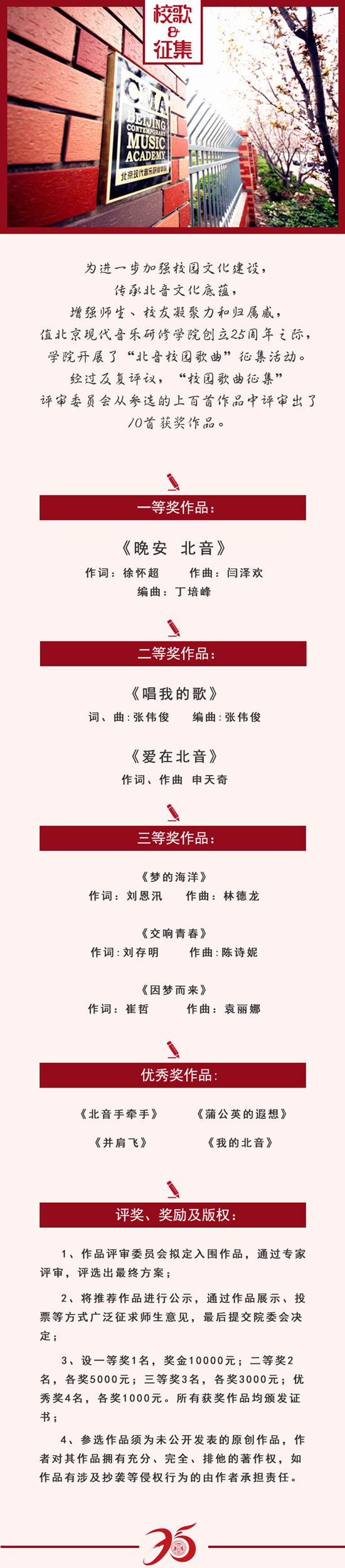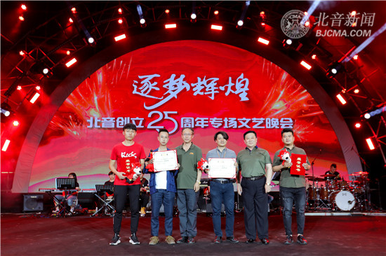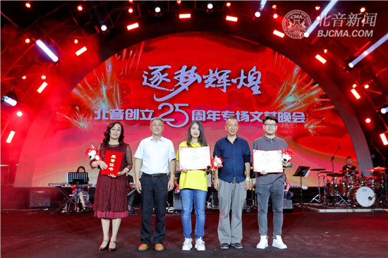 5月25日晚,“逐梦辉煌”北京现代音乐研修学院创立25周年专场文艺晚会现场,“我爱北音”校园歌曲征集活动奖项揭晓,经过反复评议,评审委员会从参选的上百首作品中最终评审出了10首获奖作品,其中徐怀超作词、闫泽欢作曲、丁培峰编曲的《晚安 北音》荣获一等奖。