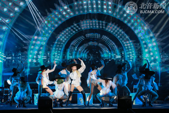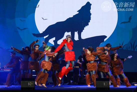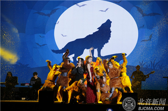 由12名男孩组成的男团B.O组合和9名女孩组成的YA组合,无疑是全程最亮眼的“鲜肉鲜花”们,唱跳俱佳的他们活力四射的表演了三首歌曲,引得现场的迷弟迷妹们欢呼雀跃,舞台上下共同摇摆,好似一场音乐派对。黑夜精灵、红眼吸血鬼、白脸小红帽等纷纷登上舞台,用空灵的嗓音演唱着歌曲《Fly》,他们将特效化妆和流行音乐演唱创意结合,将现代与欧美中古高配嫁接,展示了北音各专业文化相互交融,相互创新的艺术成果。歌曲《致敬Beyonce》由张文慧子和流行演唱学院学生共同表演,劲歌热舞,将青春阳光、积极向上精神展现的淋漓尽致。福音歌《no fear in my heart》,由张超男领唱,一院学生共同合唱,温暖和谐的画面,十分感人。