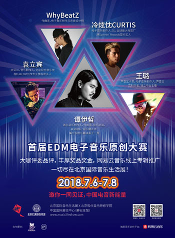 5月29日,由北京现代音乐研修学院、北京国际音乐生活展组委会联合主办的“首届EDM电子音乐原创大赛” 作品上传与投票页面正式在作为独家音乐平台支持的网易云音乐上线,截止至6月20日24:00前,全国所有对活动感兴趣的DJ、电子音乐制作人都有机会将自己优秀的原创作品上传展现在这里,著名音乐制作人谭伊哲、资深DJ北音DJ&EDM创作专业学科带头人袁立宾、全球最大电音厂牌Spinnin'Records签约艺人&北音毕业生冷炫忱、WhyBeatZ、王璐都将集结于此,为你的作品点评加持。