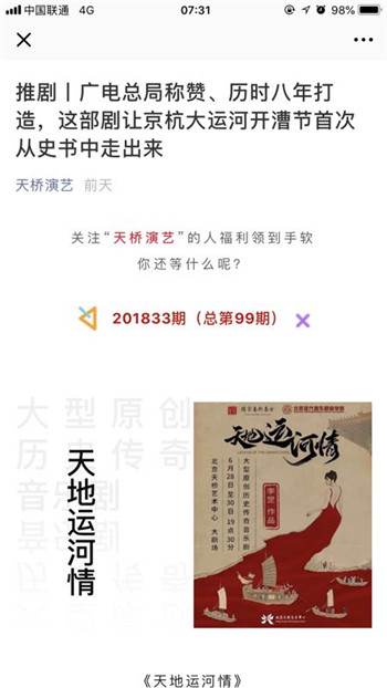 今晚19:30,2018国家艺术基金项目——北京现代音乐研修学院大型原创历史传奇音乐剧《天地运河情》将继续在北京天桥艺术中心精彩上演,首演结束后,该剧将开启全国巡演。