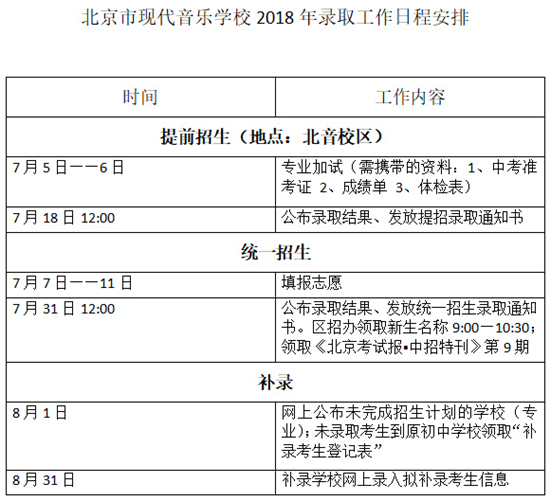 未来,想要上一所好大学,现在,必须选择一所好学校!中考刚刚结束,考生和家长们便进入了紧张地择校和填报志愿阶段。北京现代音乐研修学院附中(北京市现代音乐学校 学校代码612005)——北京城市副中心唯一的艺术中专,一所真正的明星梦工厂——2018年录取工作日程安排已经出炉,7月5日-6日将进行提前招生批的专业加试工作。