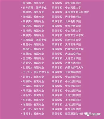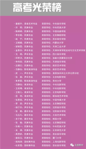 办学近二十年,北音附中培养了像《花千骨》“杀姐姐”马可、《琅琊榜》“小飞流”吴磊、电影《谁的青春不迷茫》深情学霸“黄韬”李宏毅、“2016超级女声”17强黄佳欣、“国民初恋”吴俊余、“街舞王子”黄景行、“蜜蜂少女队”成员刘雨昕、《变形计》“舞媚娘”杨馥宇、MS女团、“艺术精灵”陆敏雪、《星光大道》“最具魅力童星”开克尔曼尼、minisister女团等一大批优秀的明星学子,同时,北音附中也成为众多一线童星择校时的首选院校。