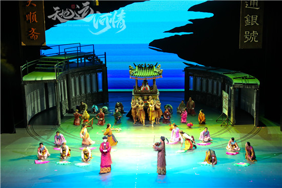 《天地运河情》表演丰满,角色众多且唱功不凡。各位主角嗓音个个有本钱,歌声有情,表演入戏,唱演无弱者。乾隆和冯河生的两位扮演者音域宽广、声区通畅,高音有力,强声有强,只是弱声略欠,差一点声音强弱色彩的对比。芸娘嗓音通畅、声音有控制,有张弛。曹跟班与姚婆子的表演令人印象深刻,嗓音有彩,台上有戏,角色鲜活。角色与剧组,重唱、合唱,节奏整齐、音色和谐。歌舞表演也有声有色。