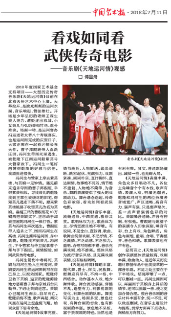 6月28-30日,首部运河题材鸿篇巨制——北京现代音乐研修学院大型原创历史传奇音乐剧《天地运河情》在北京天桥艺术中心首演好评如潮,引起了社会各界的广泛关注。7月11日,北京市艺术研究所研究员傅显舟在中国艺术报发表“看戏如同看武侠传奇电影——音乐剧《天地运河情》观感”,对音乐剧《天地运河情》给予肯定,同时,也对剧的未来提出更多建议。