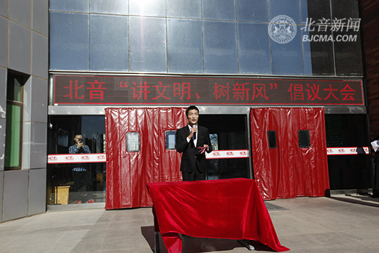 2018年11月21日中午,微风和煦,暖阳高照,北京现代音乐研修学院团委联合学生会组织开展的“讲文明 树新风”倡议大会在学院教学楼前广场上隆重举行,北音教育副院长李慧勇出席并讲话,各二级学院教育主管及师生代表参加了本次倡议活动。