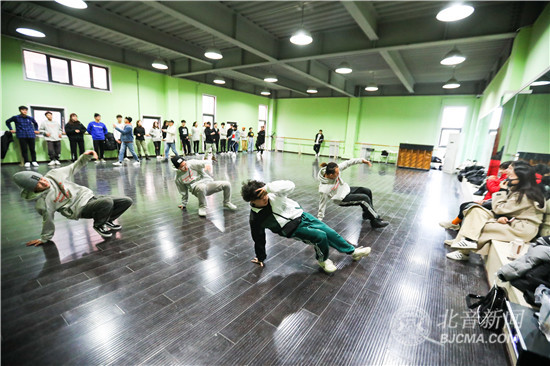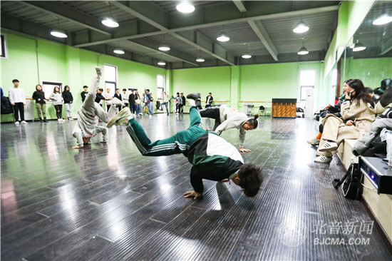当小编这枚街舞小白第一次从北音流行舞系主任、本次节目北音指导老师张晶口中听到breaking、popping等各类街舞名词时,很是激动,同时又一头雾水。于是,同学们热情地邀请小编做观众,完整地表演了一遍,轮滑和滑板“嗖”的从面前经过;四人整齐划一的踩点舞动;头部顶地倒立,像陀螺一样旋转等高难度动作一一呈现,令人惊讶。