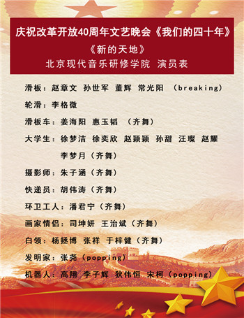 18日晚,《我们的四十年》庆祝改革开放40周年文艺晚会在CCTV-1、CCTV-3同步播出,北京现代音乐研修学院学子们和青年歌手孙楠、谭维维共同上演了一台精彩的“街舞秀”和情景演唱与舞蹈《新的天地》,用新时代青年的阳光热情,向祖国母亲致敬。