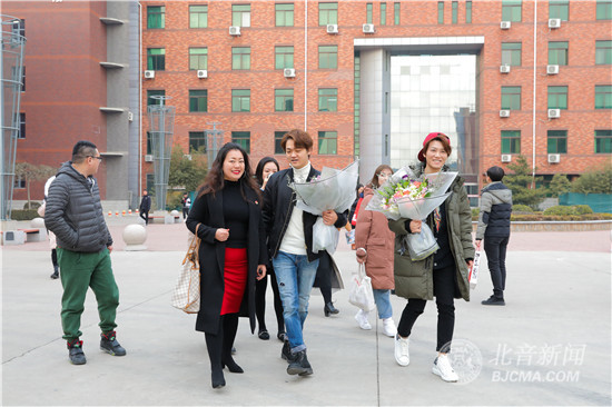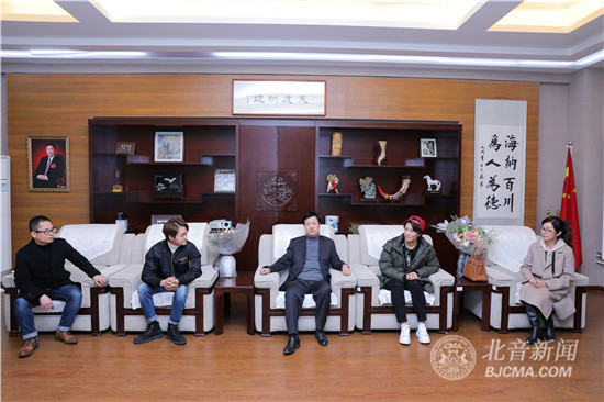 一进校门,在欢呼声与掌声中,展展和罗罗受到了来自老师和同学们的热烈欢迎。再回母校,展展和罗罗很是激动,在与老师同学们热情招呼之后,他们第一时间地来到了院长办公室,向李平院长敬献鲜花和新EP,感谢学院对他们的悉心培养。李平院长代表学院授予展展与罗罗颁发“金穗奖”荣誉证书,充分肯定了他们在专业领域取得的突出成绩,邀请他们出席2019北音毕业典礼,并鼓励他们继续坚持创作更多优秀的作品。