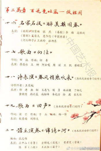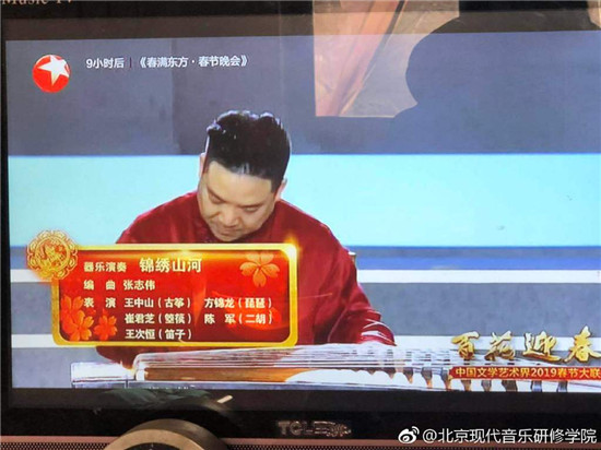 由中国文学艺术界联合会主办的“百花迎春”中国文学艺术界2019春节大联欢于大年初一正式登陆东方卫视、北京卫视、江苏卫视、浙江卫视等七大卫视,以及中国人民广播电台、中国数字电视书画频道以及爱奇艺视频,为全国人民带来中国文艺界的一次文化盛会。北京现代音乐研修学院音乐科技学院 声音设计 教研室主任张志伟老师为中国民乐届大师王中山(古筝)、方锦龙(琵琶)、崔君芝(箜篌)、陈军(二胡)、王次恒(笛子)编曲作品《锦绣山河》,作品沉稳大气,再现了中国国乐魅力!