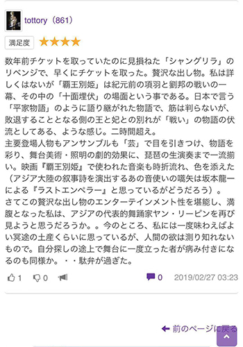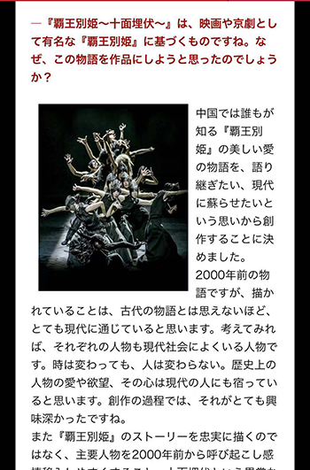 《霸王别姬 —— 十面埋伏》其素材来自于中国秦末汉初历史,它既表现了一段波澜壮阔的战事,又表现了一段凄美的爱情故事。日本观众对于能够观赏到如此精湛的舞蹈剧纷纷表示:“ 这个故事很新颖,与我们的编剧方式不同,虽然没有看到杨丽萍登台有些遗憾,但是年轻的舞者们都很棒。”